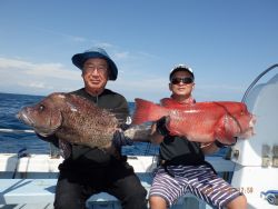8/12 静岡市の稲岡さん、名古屋市の吉村さん 4名 ヒゲダイ 65〜70p 2尾 クエ 60p 1尾 水温 30.0℃ |